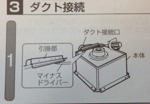 _換気扇の排気ダクトの塩ビ管への取り付けがどのようか分からなかった。ネジをすべて外してさてと・・・。天井側に取り外そうと思ったが取り付け枠より多きい下側の留め枠なので上には抜けない。上から斜めにして下へ。駄目だこちらも排気ダクト部分が大きすぎて抜けない。